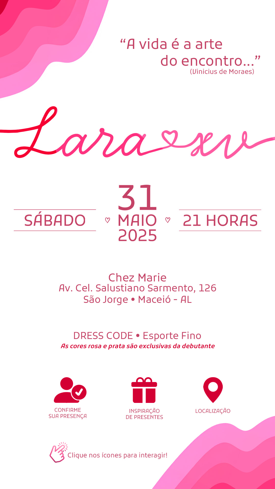 O convite interativo do LARAXV une charme e praticidade: cores vibrantes, tipografia delicada e detalhes que refletem a identidade do evento. A frase inspiradora de Vinicius de Moraes reforça o tom poético do momento. Com ícones clicáveis para confirmação, presentes e localização, transforma o convite em uma experiência digital envolvente e especial para os convidados.