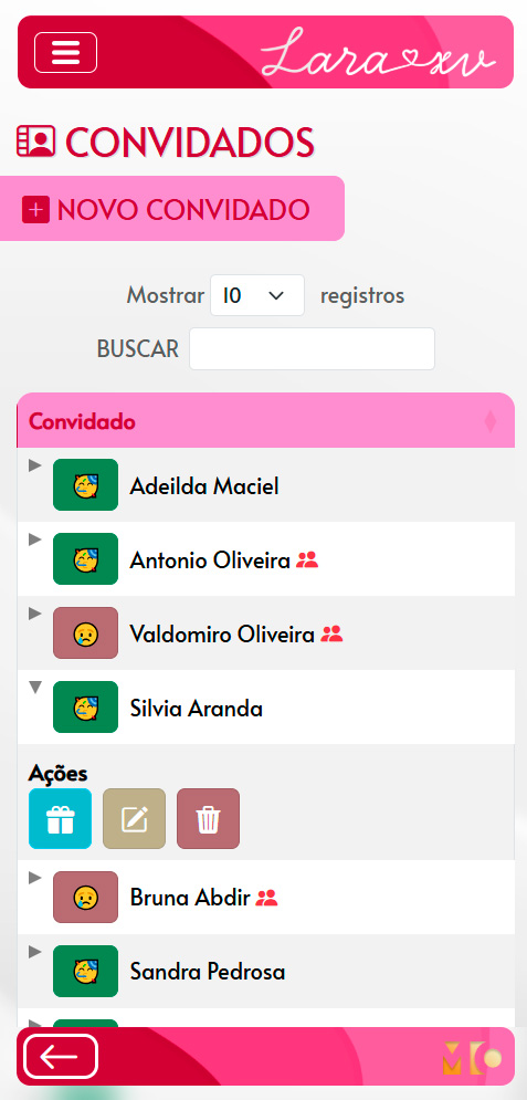 O webapp do LARAXV foi desenvolvido para facilitar toda a organização do evento em um só lugar. Com design alinhado à identidade visual da festa, ele permite gerenciar convidados, acompanhar confirmações de presença, organizar mesas, enviar lembretes, enviar o QRCode de acesso, controlar presentes e até liberar o álbum de fotos. Intuitivo e funcional, o app transforma a administração da festa em uma experiência simples, moderna e totalmente integrada.