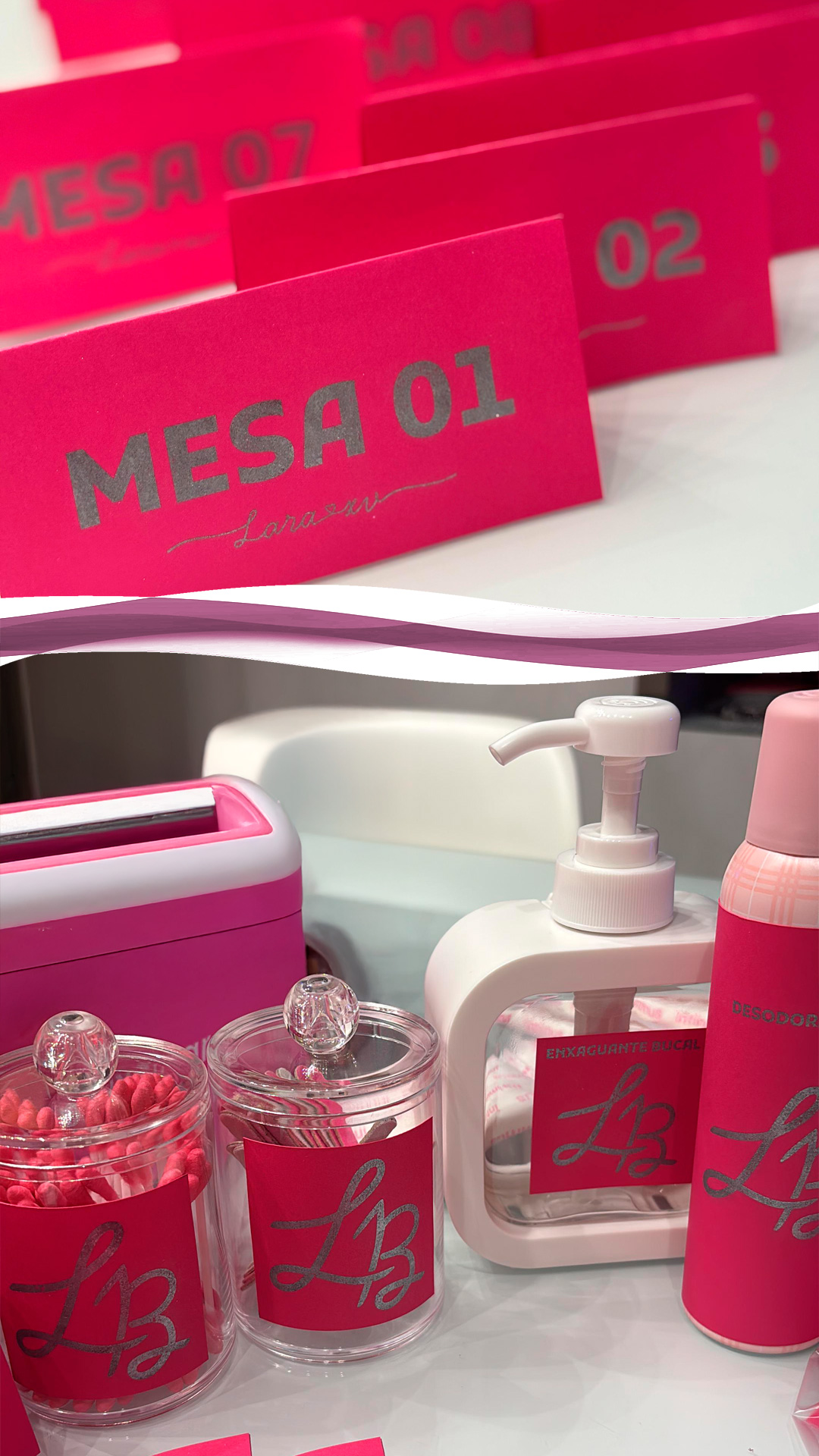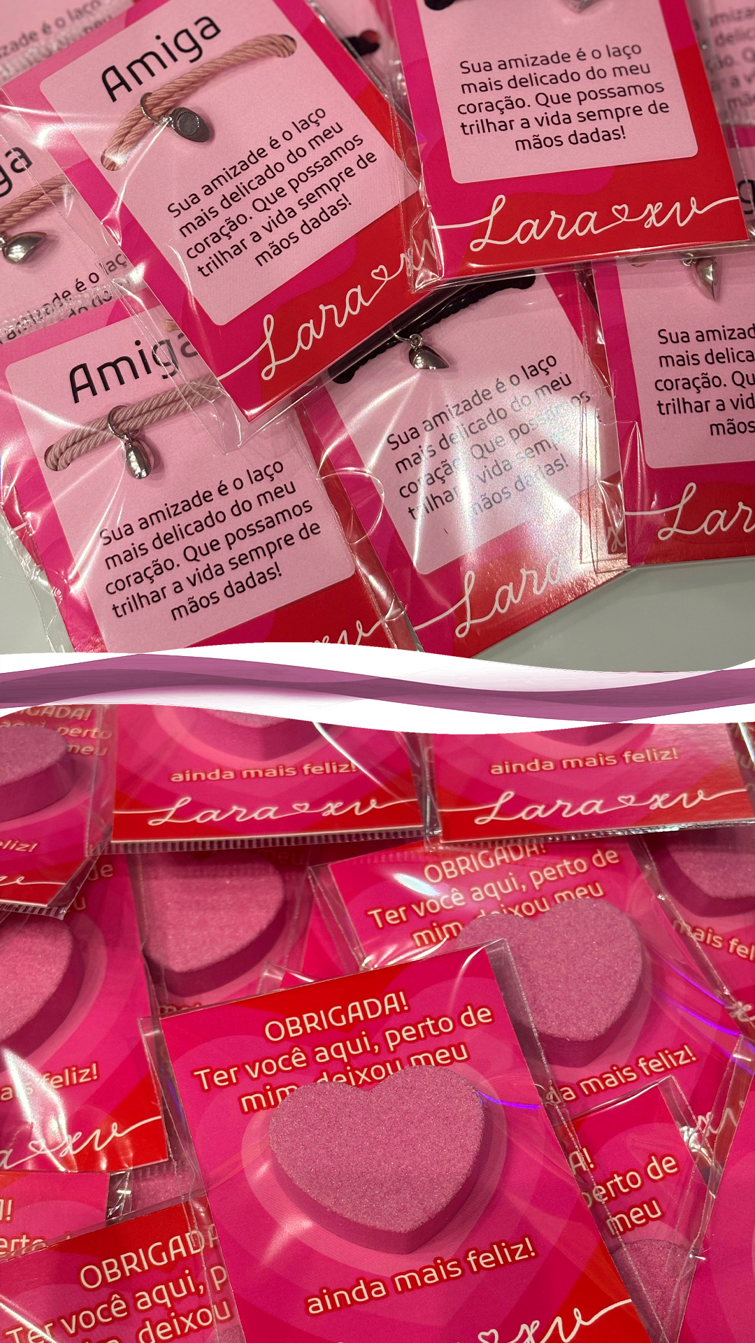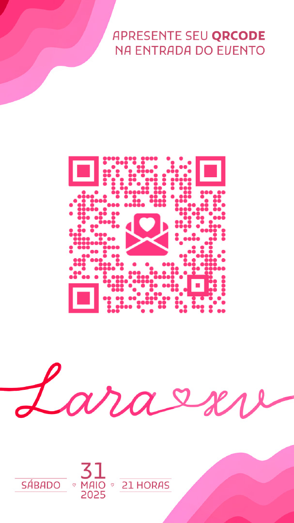 A identidade visual do Lara XV é delicada, moderna e cheia de personalidade. Os tons de rosa e vermelho transmitem alegria e celebração, enquanto a tipografia com coração traz um toque romântico e especial — perfeito para marcar um momento inesquecível.