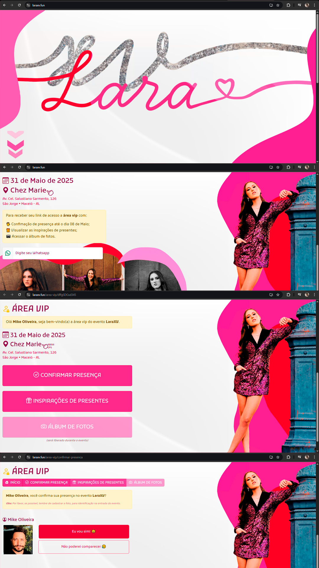 O website do LARAXV foi desenvolvido para ser moderno, funcional e totalmente integrado à identidade visual do evento. Nele, os convidados podem acessar informações essenciais da festa, confirmar presença, consultar inspirações de presentes, visualizar e interagir com o álbum de fotos na área VIP. Com visual vibrante e navegação intuitiva, o site transforma o convite em uma experiência digital completa e interativa.