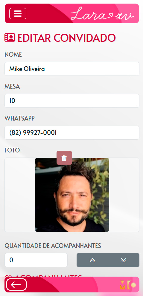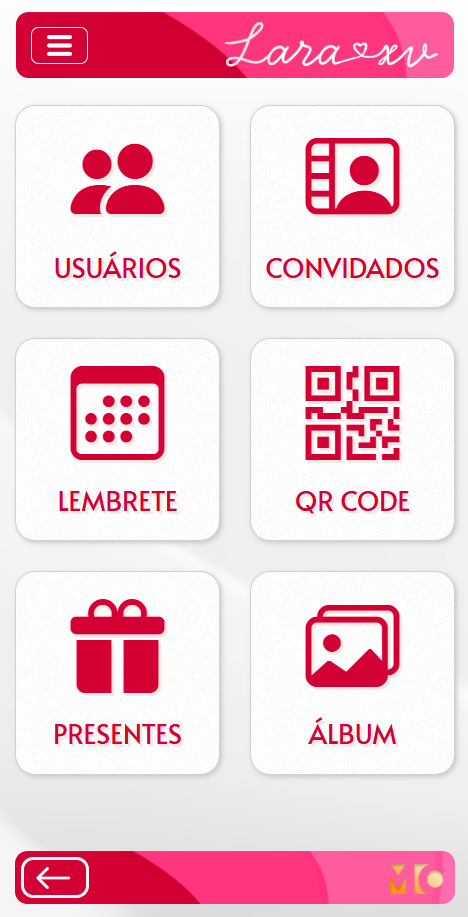 O webapp do LARAXV foi desenvolvido para facilitar toda a organização do evento em um só lugar. Com design alinhado à identidade visual da festa, ele permite gerenciar convidados, acompanhar confirmações de presença, organizar mesas, enviar lembretes, enviar o QRCode de acesso, controlar presentes e até liberar o álbum de fotos. Intuitivo e funcional, o app transforma a administração da festa em uma experiência simples, moderna e totalmente integrada.